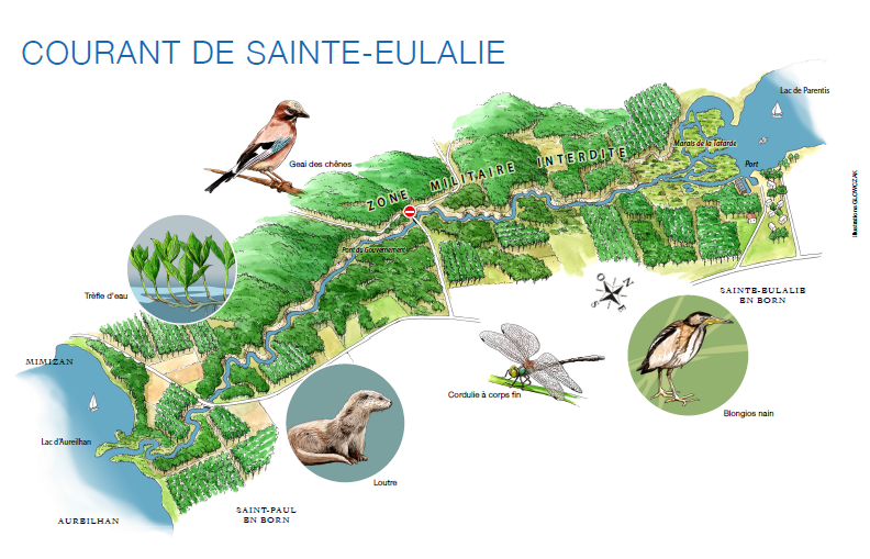 Parallèlement à la côte landaise, sous le couvert de la forêt, le Courant de Sainte-Eulalie relie en 7 km l’étang de Biscarosse / Parentis à celui d’Aureilhan. La particularité de ce courant est son dénivelé important pour un cours d’eau landais (14 m sur sa longueur totale) !