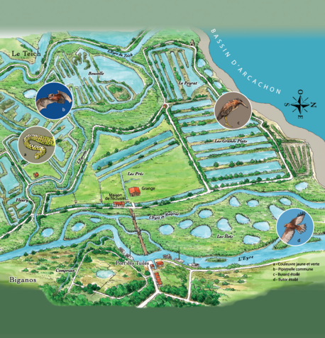 C’est un paysage « horizontal » qui attend le visiteur. Celui-ci chemine le long des prairies, entourées de haies, puis arrive sur les anciens bassins et le paysage s’ouvre, le goût du large se fait sentir. Parvenu à l’extrémité nord-ouest de l’île, c’est la découverte des prés salés qui bordent l’extérieur du domaine et à perte de vue le Bassin d’Arcachon.