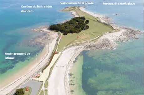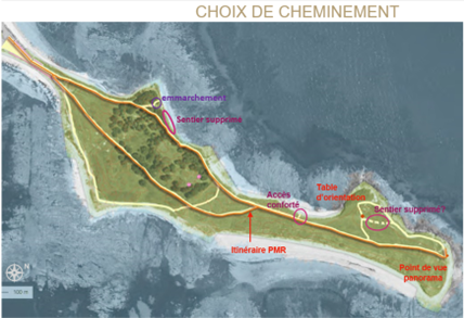 • La valorisation paysagère du site par la création de points de vue sur la mer depuis le sentier reculé (élagage des arbres très denses), la reprise des aménagements à l'extrême pointe, aujourd'hui abimés et peu compréhensibles (fréquentation anarchique avec dégradation des milieux fragiles)